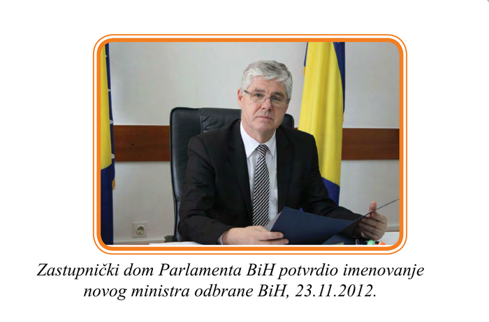 Novembar 2012. – Imenovan novi ministar odbrane Zekerijah Osmić, zahvaljujući kojem je u toku 2013. godine započelo knjiženje perspektivne vojne imovine.